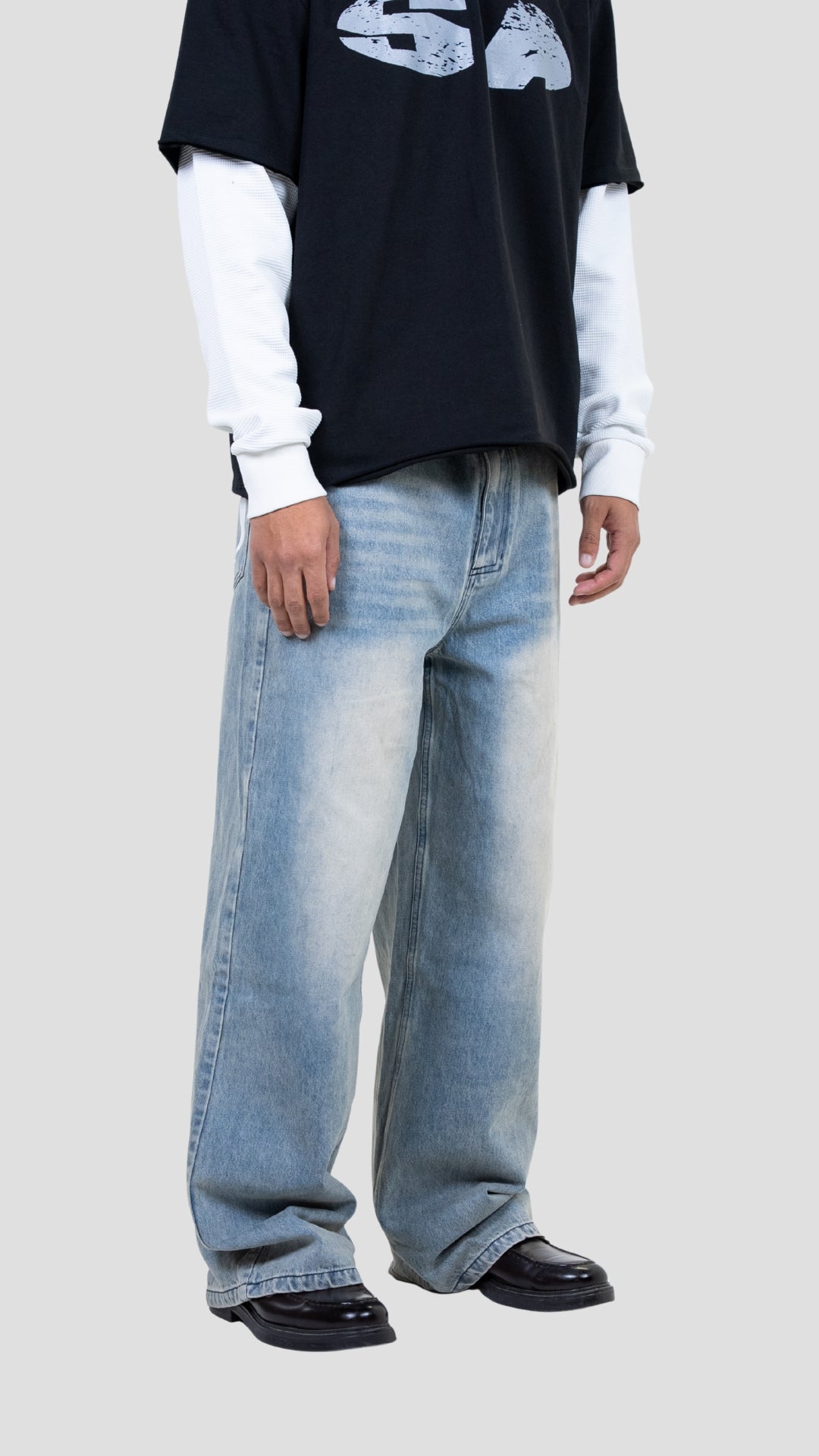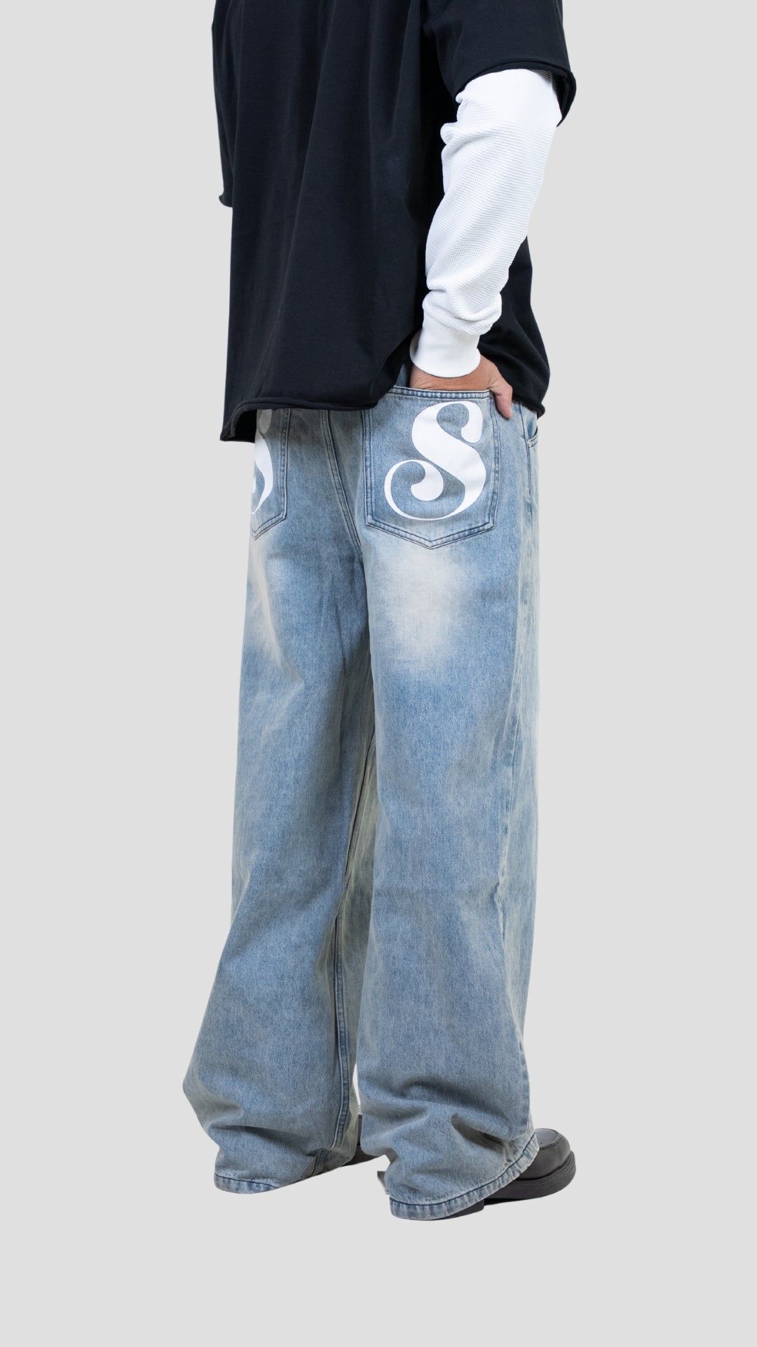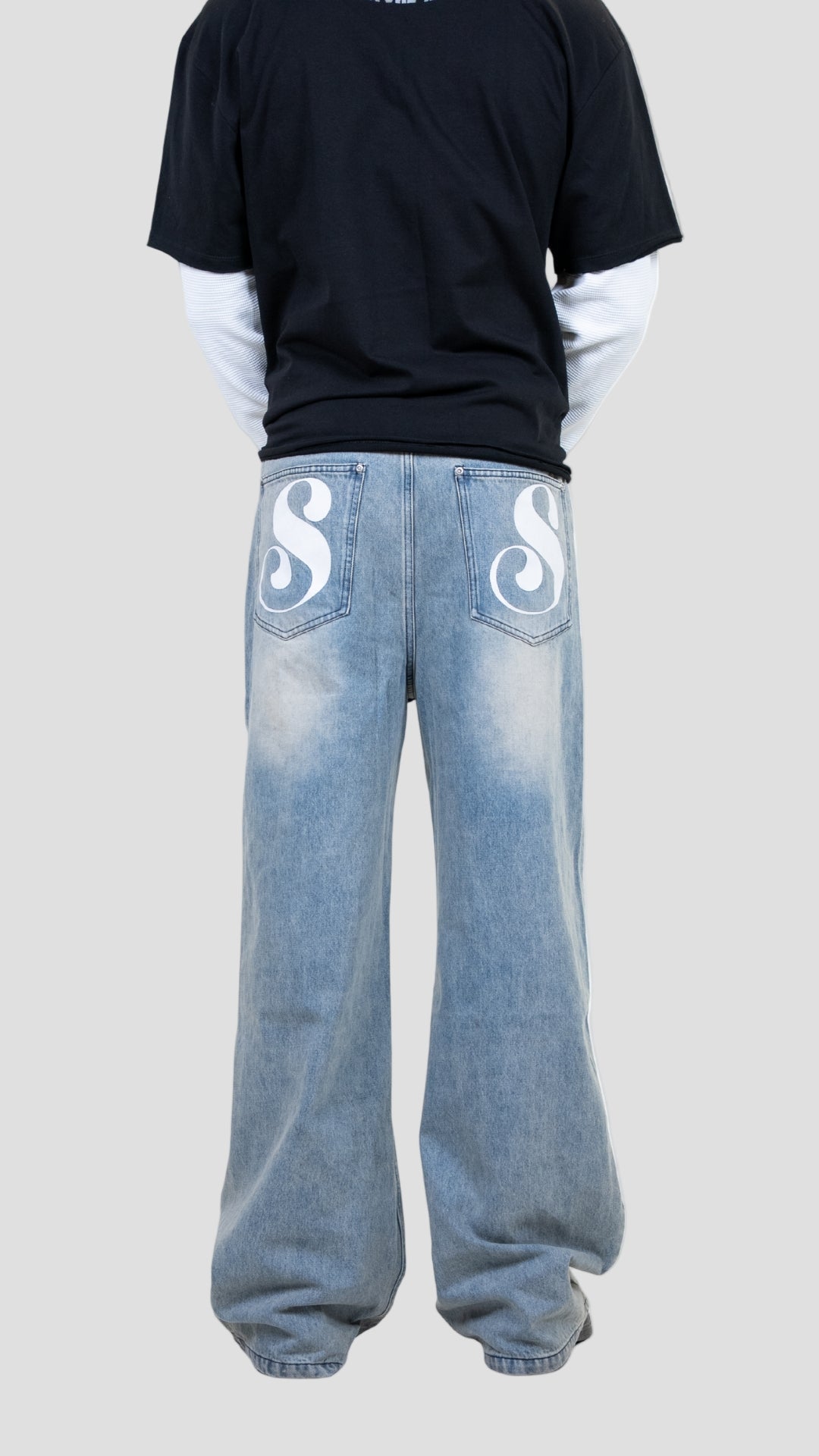 These denims are cut to a loose/baggy fit with a low waist and wide, long legs. featuring a wash with irregular bleaching for an authentically worn-in look. A core piece in the collection, the "WEAR AND TEAR" denims embodies effortless confidence and elevated minimalism. The back pockets feature the dual "S" logo as a signature mark.