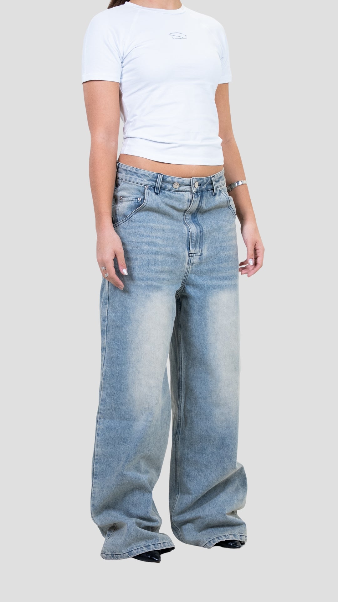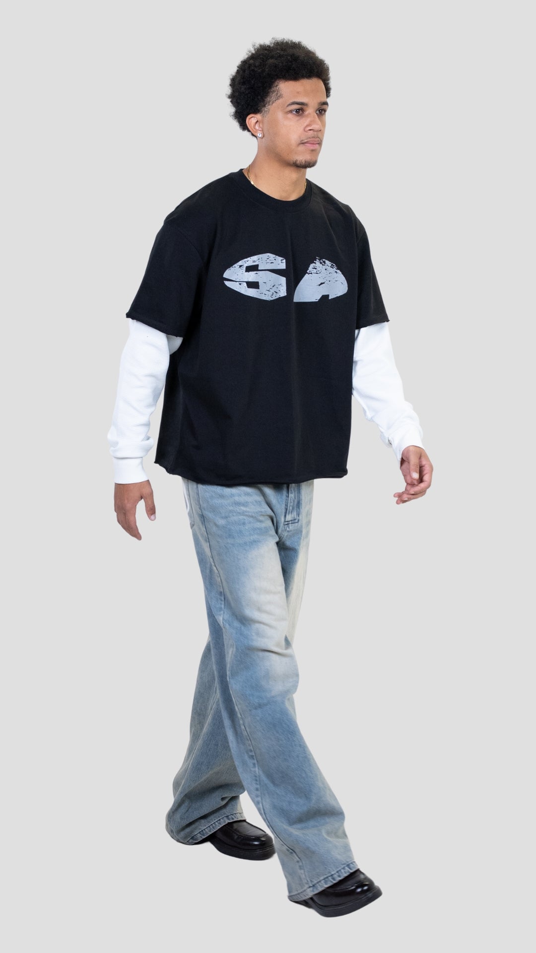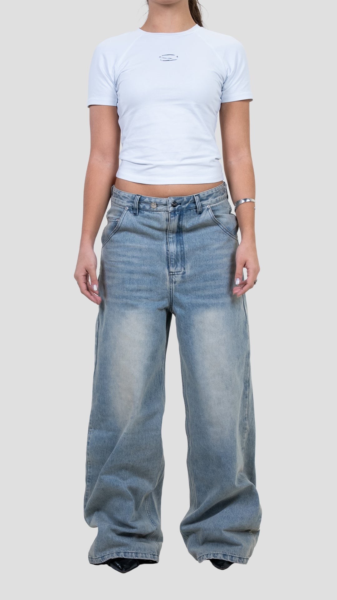 These denims are cut to a loose/baggy fit with a low waist and wide, long legs. featuring a wash with irregular bleaching for an authentically worn-in look. A core piece in the collection, the "WEAR AND TEAR" denims embodies effortless confidence and elevated minimalism. The back pockets feature the dual "S" logo as a signature mark.